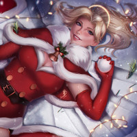 an illustrated character lying on her back with a festive holiday theme. The character is wearing