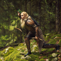 green forest surroundings with trees and mossy rocks. They are holding a bow and seem to be poised for action, possibly pretending to be on guard or ready for combat. The attire suggests a medieval or