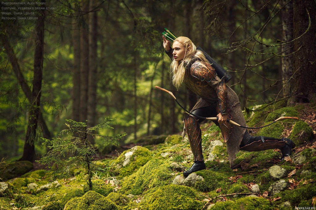 In the image, there is an individual dressed in what appears to be a fantasy or elf costume. The person is standing amidst lush