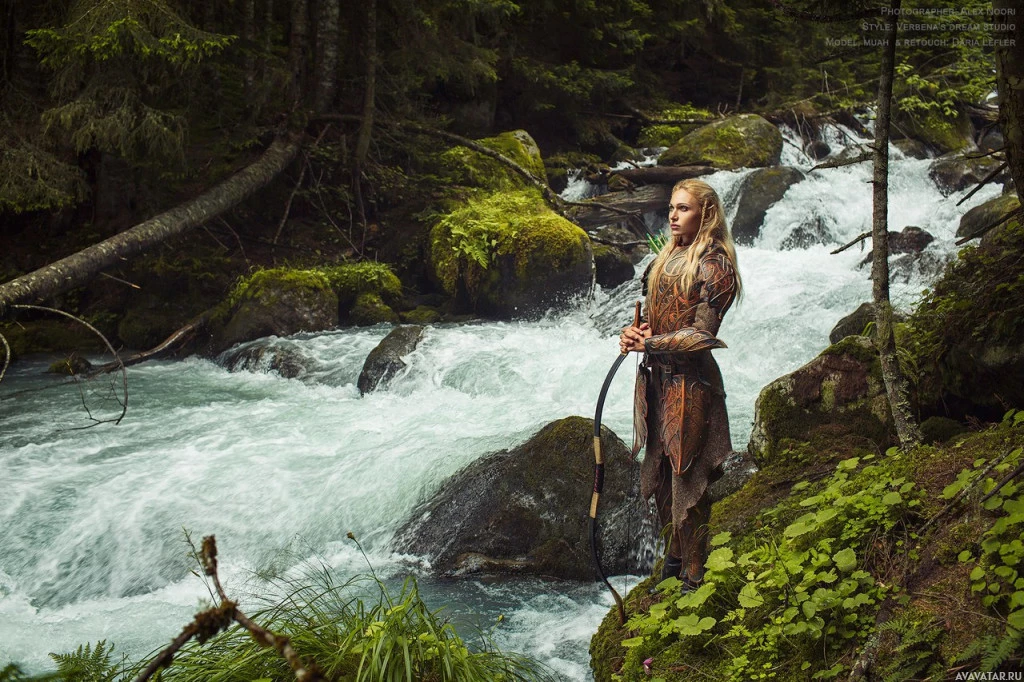a fantasy scene. The individual is dressed in what seems to be a costume or makeup that gives them an elven-like appearance, complete with