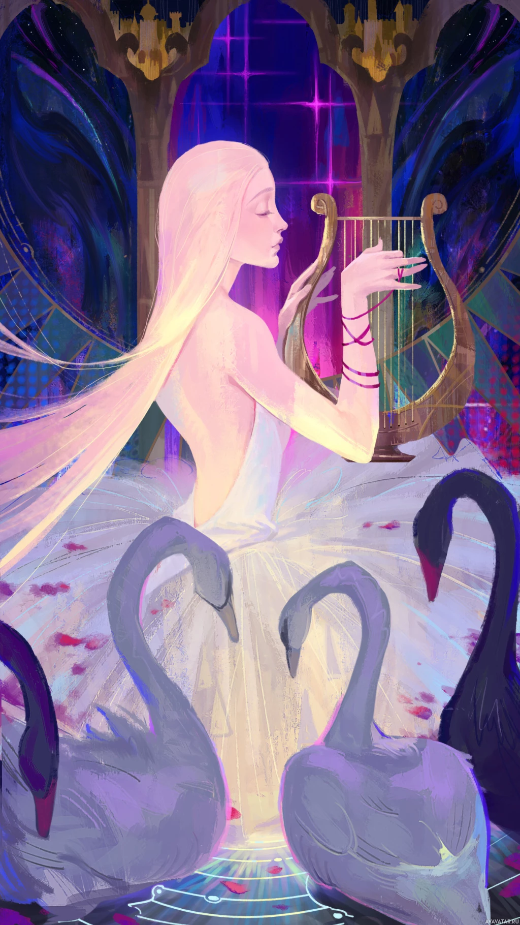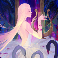 white hair, closed eyes, and what appears to be her playing an instrument or singing. Surrounding her are several swans in