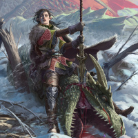 sharp teeth and scales, and it occupies most of the background. Its position suggests that it was in flight or had been attacking when it was struck down. The setting is outdoors with a wintry landscape. There are snow-covered rocks and trees around, which indicates a cold environment, possibly during winter. The style of the artwork is detailed and illustrative, common for fantasy genres in books or video games.