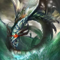 The image features a fantastical dragon-like creature. It has the head of a human with horns, and it is surrounded by water or waves that suggest it could be underwater. The artwork is vibrant with colors such as blue for the sea and green for the skin of the creature, accented with highlights to give a sense of light reflecting off its body. The overall style suggests it could be part of a fantasy-themed illustration or concept art.