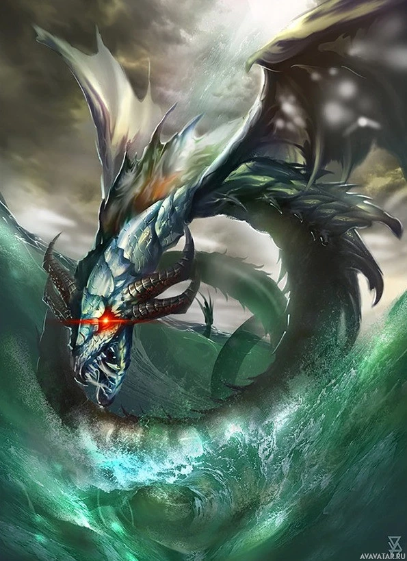 На картинке изображено фантастическое драконоподобное существо. У него голова человека с рогами, и он окружен водой или волнами, которые предполагают, что он может быть под водой. Художественное произведение яркое с такими цветами, как синий для моря и зеленый для кожи существа, акцентированный с изюминками, чтобы дать ощущение света, отражающего его тело. Общий стиль предполагает, что он может быть частью фэнтезийной иллюстрации или концепт-арта.