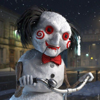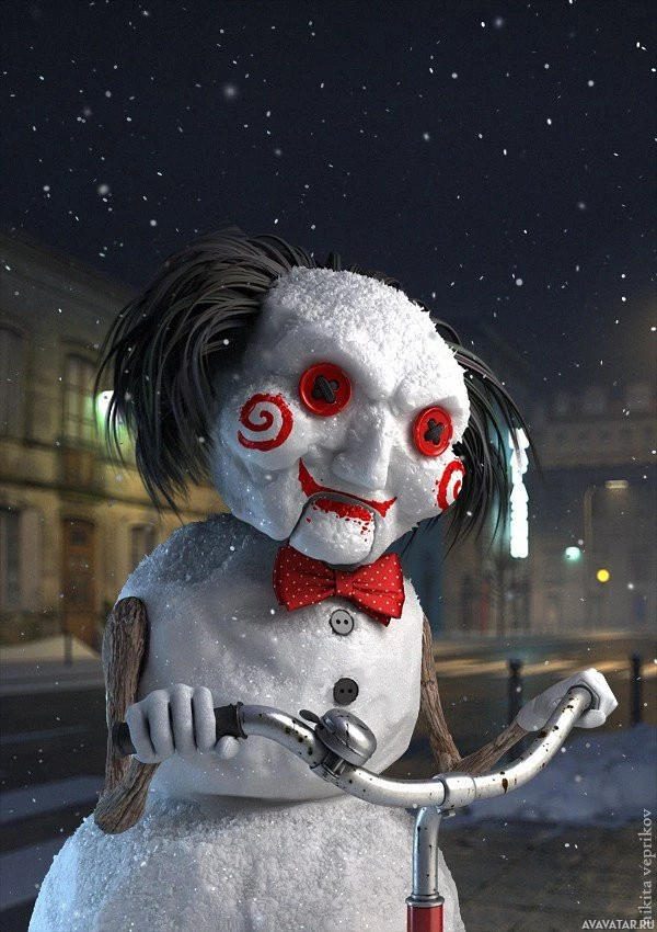 red eyes, and a wide grin, set on top of a body made of snow. It is sitting on a bicycle, and the setting looks like an urban