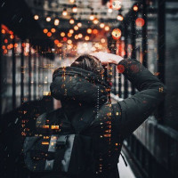 lights in the background that create a blurred effect, giving the impression of a cityscape with light trails. The individual is facing away from the camera and seems to be looking upward, possibly towards the lights or sky. They appear to be wearing a backpack, suggesting they might be traveling. The image has