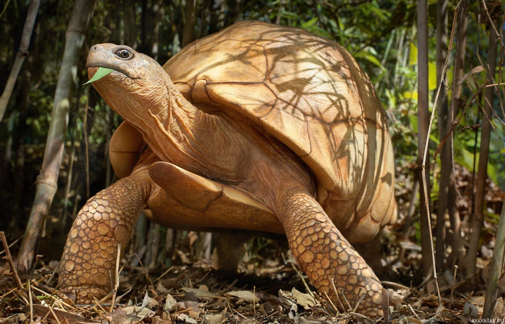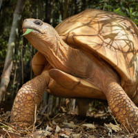 The image features a tortoise, which is an animal, not a turtle. It is standing on dry ground, possibly in a natural habitat with vegetation and fallen leaves around it.