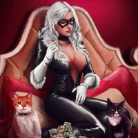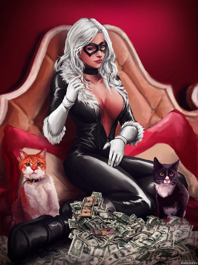 female character dressed in a black and white costume, resembling a superhero or vigilante theme. She is sitting on what appears to be a throne with red cushions, surrounded by two