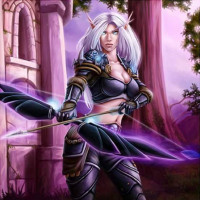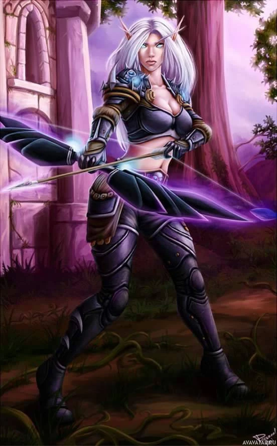 a female character with white hair styled into pointed ears, wearing armor that suggests an elven or fantasy theme. She is holding a bow and arrow, indicating she may be