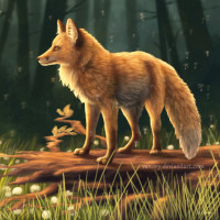 The image features an illustrated fox sitting on what appears to be a stump or log in a forest setting. The background shows trees and foliage, indicative of a woodland environment. There are also small white flowers scattered on the ground around the fox, adding to the natural ambiance of the scene.