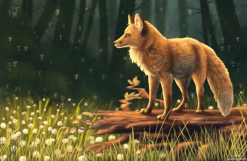На картинке изображена иллюстрированная лиса, сидящая на том, что кажется пнем или бревном в лесу. На заднем плане изображены деревья и листва, что свидетельствует о лесной среде. Есть также небольшие белые цветы, разбросанные по земле вокруг лисы, что добавляет естественной атмосферы сцены.