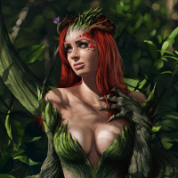 a fantasy character with red hair, sitting among green foliage. She appears to be a dryad, which is