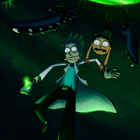animated characters, Rick Sanchez and Morty Smith, who are the main protagonists of the adult animated television series "Rick and Morty." They appear to be in a space-themed setting with green