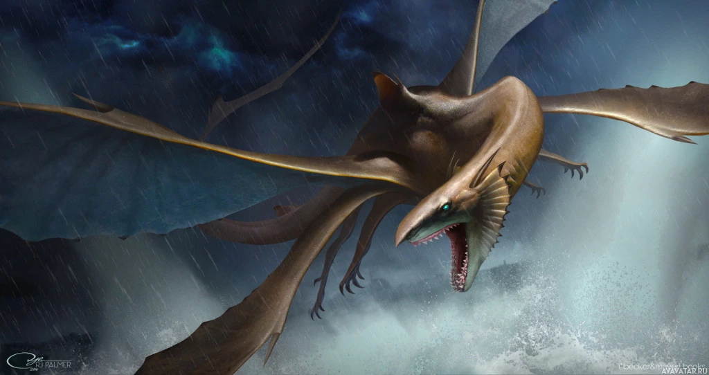 На картинке изображена фантастическая сцена с драконом, парящим в драматическом облачном небе. Дракон кажется величественным и мощным, его крылья широко расставлены, а чешуя сверкает в свете того, что кажется бурным или ночным. Художественный стиль детализированный и реалистичный, это может быть цифровая картина или иллюстрация, а не фотография.