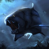 a fantastical scene where a shark-like creature is emerging from the water, with its mouth open as if roaring or showing teeth. The setting appears to be a nighttime