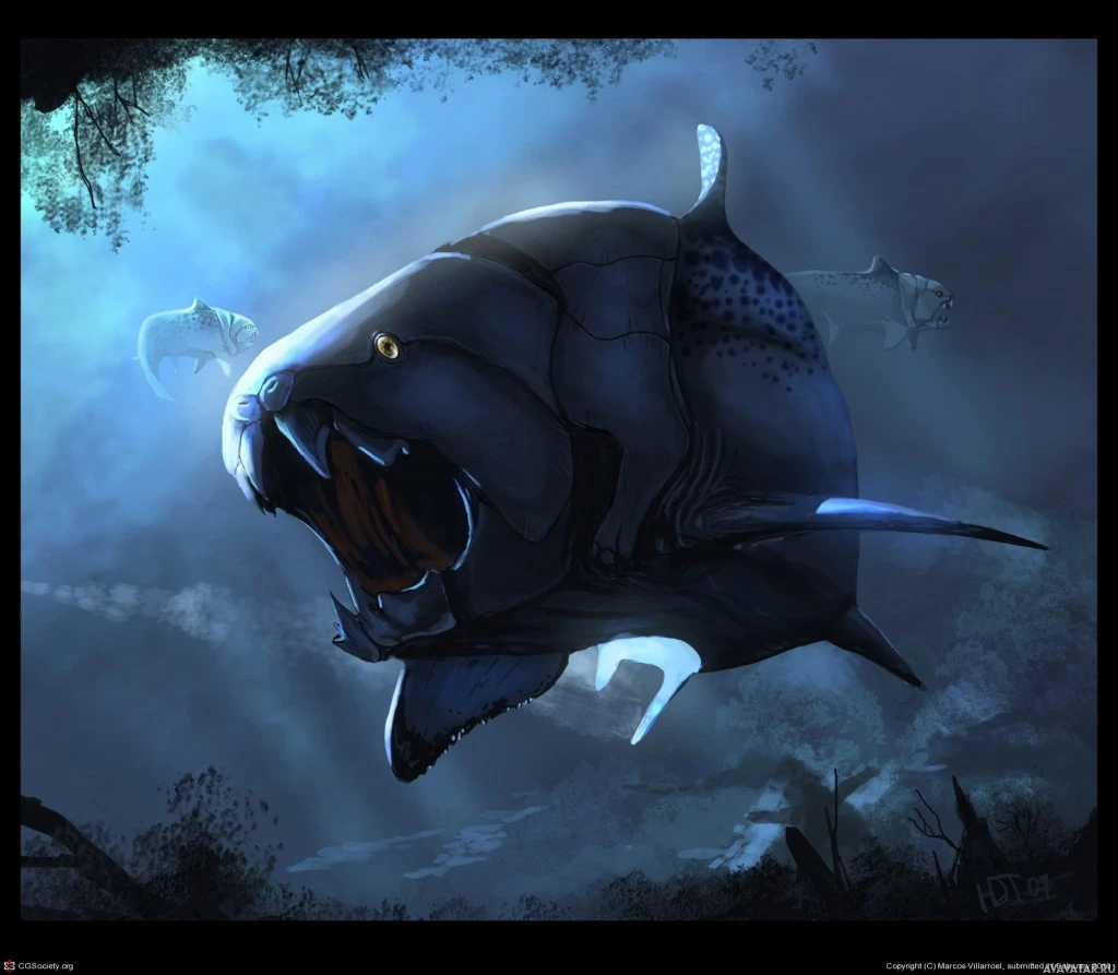 underwater environment, given the darkness and the faint light emanating from what could be bioluminescent organisms in the background. The creature itself has a robust