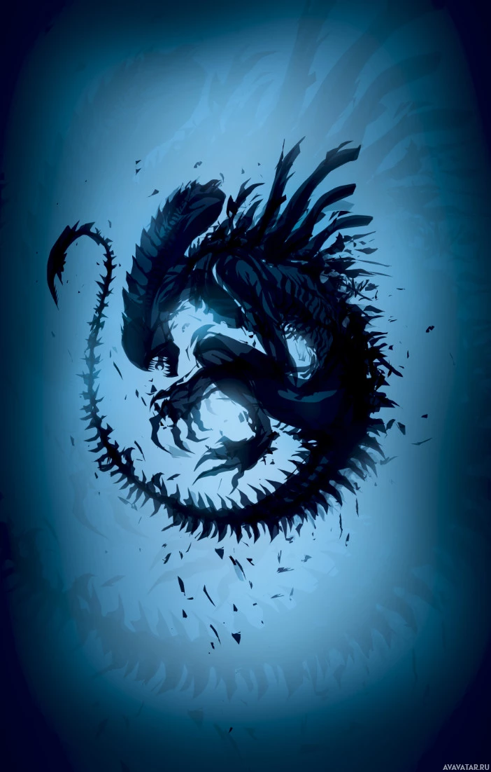 Изображение, по-видимому, является иллюстрацией или произведением искусства, вдохновленным культовой сценой «честеров» из фильма «Чужие». На ней изображено существо с колючими выступами, прорывающееся через то, что кажется грудью инопланетянина. Этот стиль изображения обычно ассоциируется с жанрами ужасов и научной фантастики.