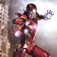 The image shows a character dressed in an Iron Man suit, which is a well-known superhero from the Marvel