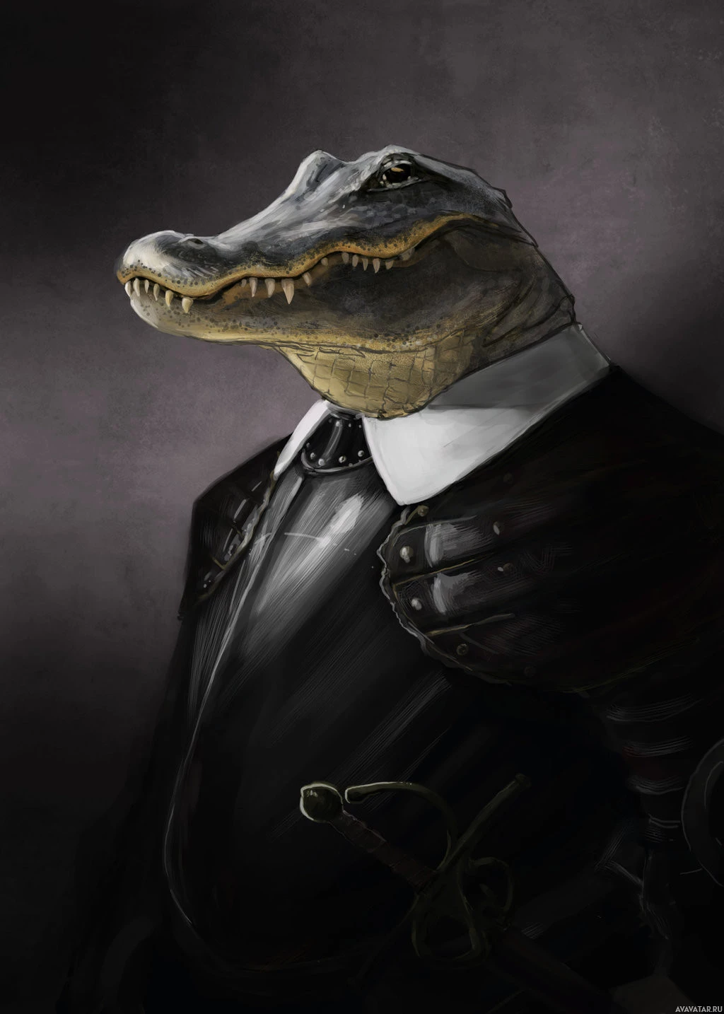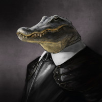 The image features a crocodile with anthropomorphic characteristics, dressed in