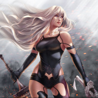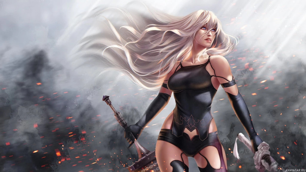 Это изображение женского персонажа из видеоигры «Nier: Automata». Она кажется воином или комбатантом, как предполагают ее доспехи и оружие. Фон включает в себя такие элементы, как взрывы и дым, что указывает на сцену битвы.