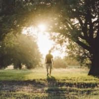 the setting sun creates silhouettes of the trees and highlights the sky's colors. There are no other individuals visible in the image, and the focus is on this single person and the serene