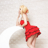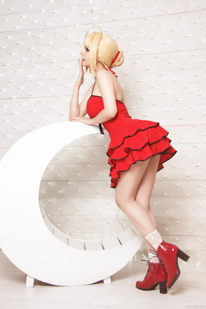 The image shows a person posing for the photo. The individual appears to be wearing a red, ruffled dress with a white collar and has
