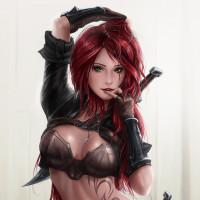 The image depicts an illustrated character, likely representing Katarina from the video game "