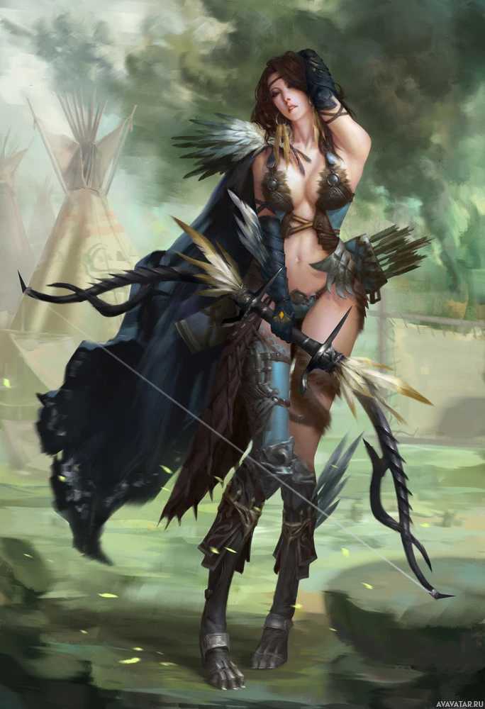 wilderness area with tents in the background, which could indicate a tribal or primitive living arrangement. Her attire includes feathered elements and what seems to be