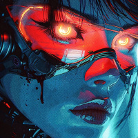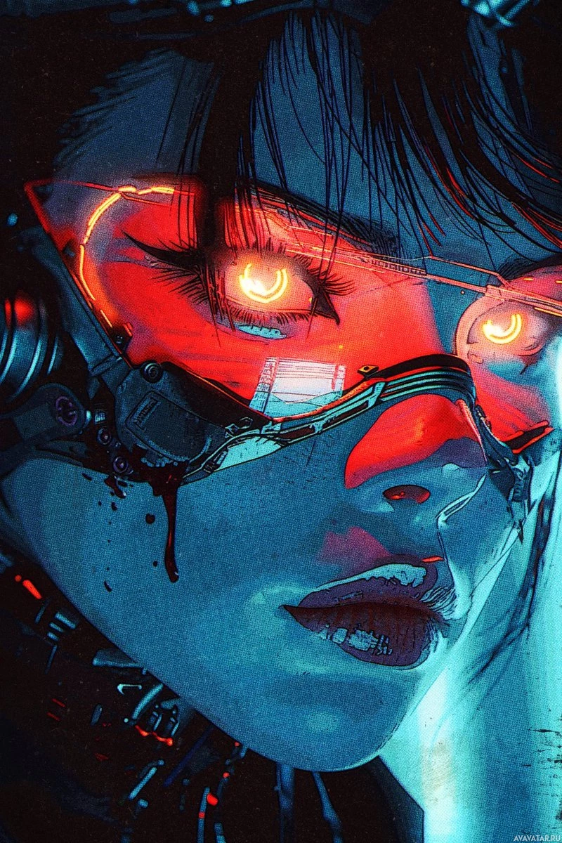 shades of blue, red, and silver, giving it an icy, high-tech feel. The character's expression is serious and focused, suggesting she might be a cybernetically enhanced operative or perhaps a figure from science fiction or fantasy genres. The image does not depict any glasses, as there are no visible frames on the character's face.