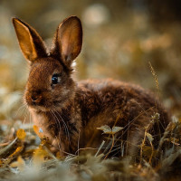 На картинке изображен маленький кролик, также известный как котенок или кролик. Он имеет большие уши и смотрит прямо в камеру со спокойным выражением лица. Фон состоит из осенних листьев на земле, предполагая, что эта фотография была сделана в естественной обстановке на открытом воздухе в осенний сезон.