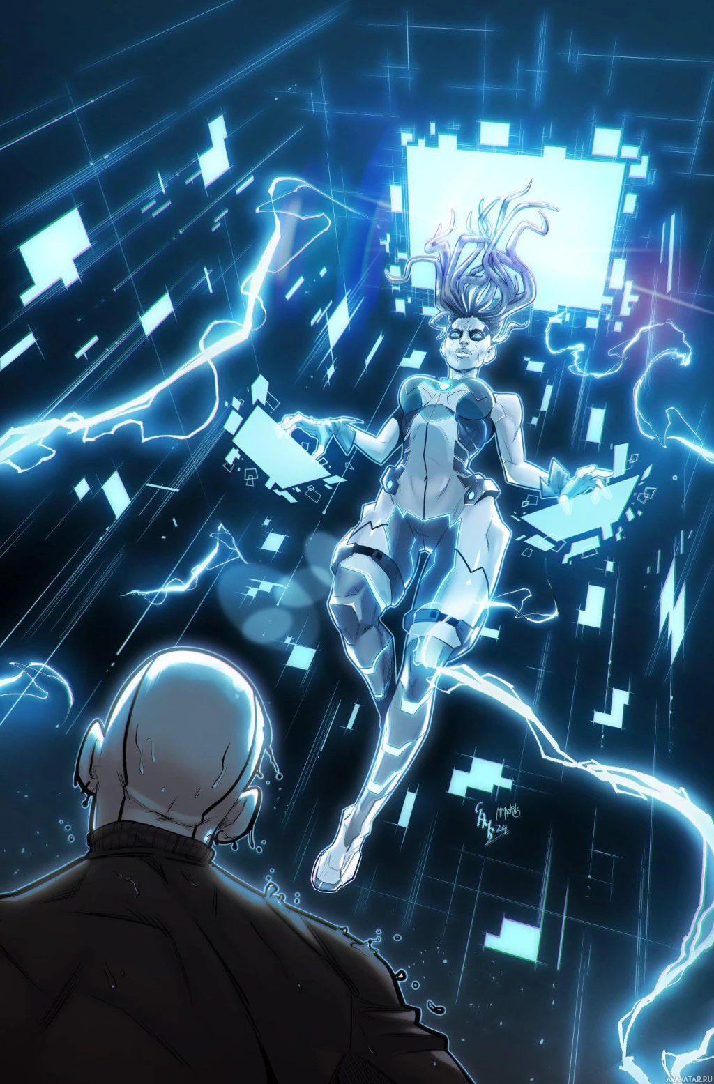 technological environment or perhaps a cybernetic space. There are grid-like structures resembling computer chips or circuitry, as well as bright blue lighting that could suggest energy flow or power sources within this setting. The overall style of the image suggests a narrative related to science fiction, particularly exploring themes of artificial intelligence, robotics, and perhaps humanity's relationship with technology. The artwork is detailed and appears to be professionally created, likely intended for illustration in a comic book or graphic novel context.