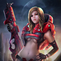 The image features a stylized illustration of a female character. She has blonde hair, is holding what appears to be a weapon in her hand, and is wearing an armor-like outfit with red accents. The setting suggests a futuristic or dystopian environment, possibly indicating a science fiction theme for the image.