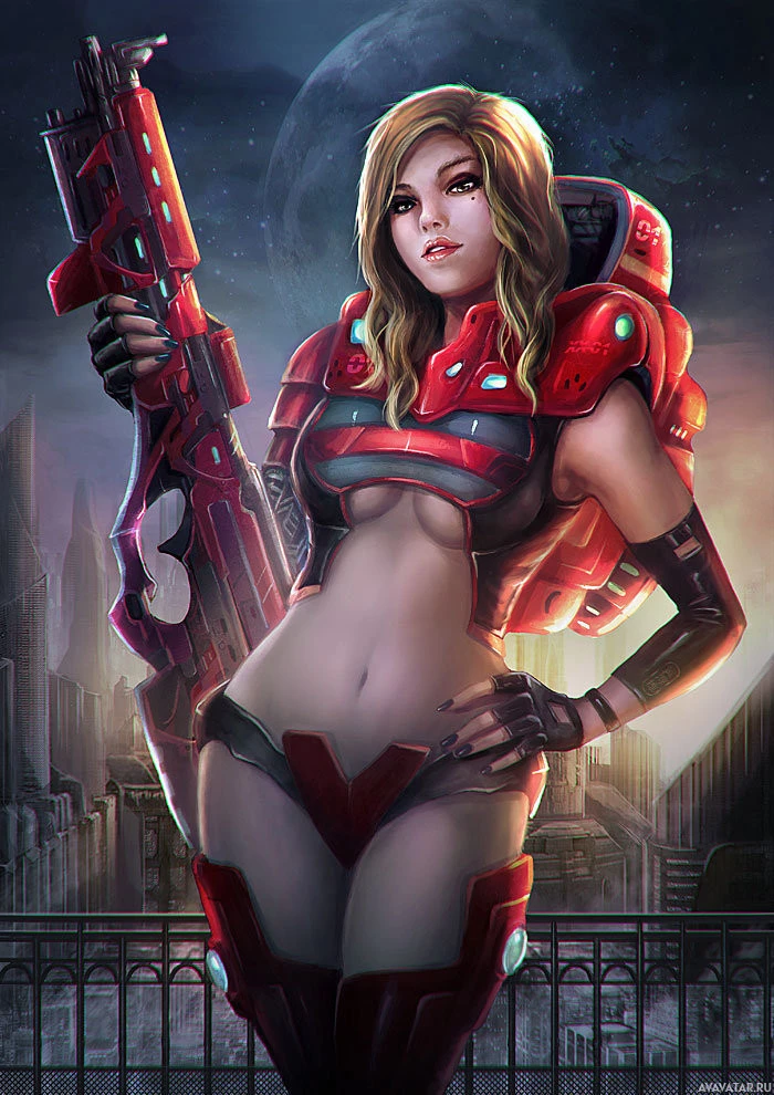 Изображение имеет стилизованную иллюстрацию женского персонажа. У нее светлые волосы, она держит в руке то, что кажется оружием, и носит наряд, похожий на доспехи, с красными акцентами. Обстановка предполагает футуристическую или антиутопическую среду, возможно, указывающую на научно-фантастическую тему для изображения.