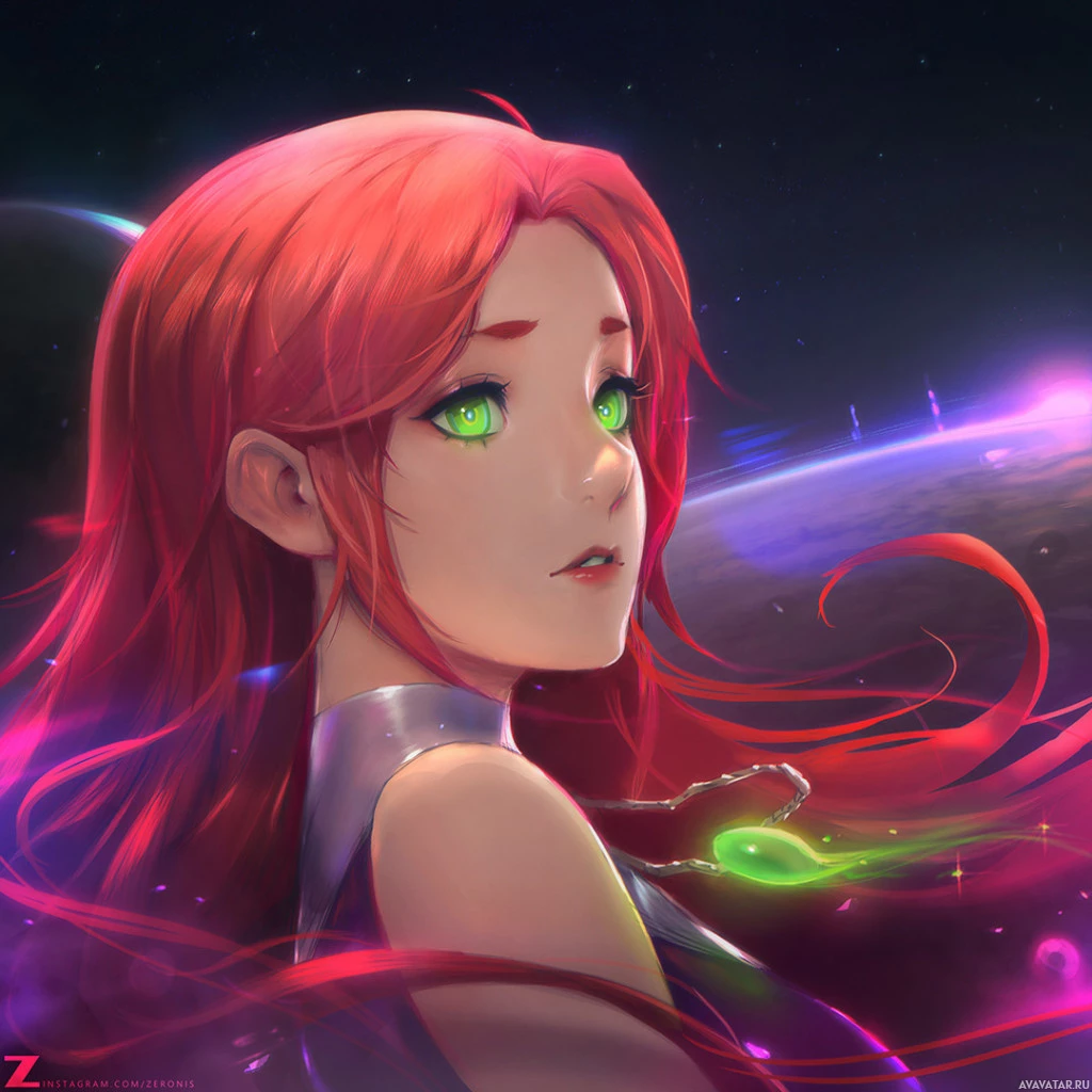 red hair, wearing a futuristic-looking outfit. She appears to be in a space or
