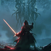 a fantasy scene with elements that could be associated with both Star Wars and Cthulhu. In the foreground, there is a character dressed in robes holding a lightsaber, suggesting a connection to