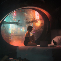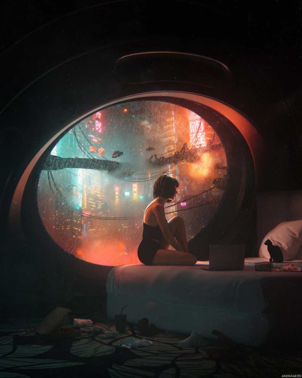 a young woman sitting on the edge of her bed in a room with an unusual circular window that provides a panoramic view of a vibrant cityscape at night. The