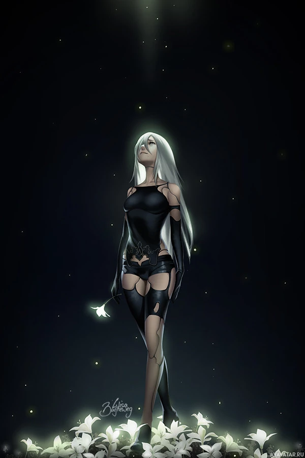 the video game "Nier: Automata." She is depicted in an illustrative style, standing amidst what appears to be a forest or