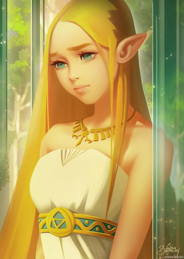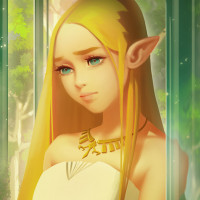 blonde hair, pointed ears, and is wearing what appears to be ancient or fantastical attire, with a golden necklace or medallion around her neck. The background suggests a serene