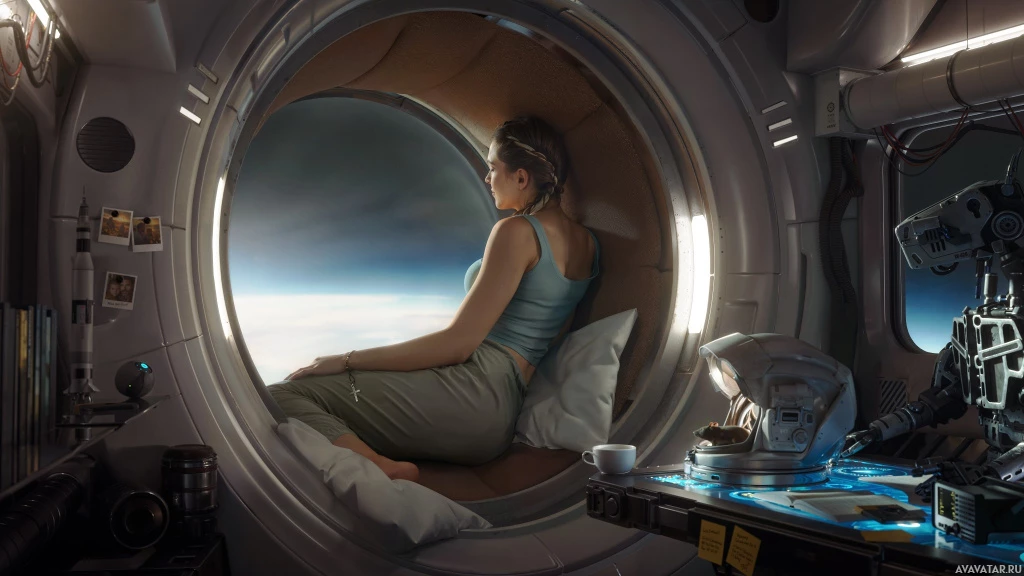 the cockpit of a spacecraft. From behind, we can see the profile of this individual who seems to be focused on something outside the window, which is showing