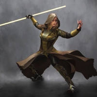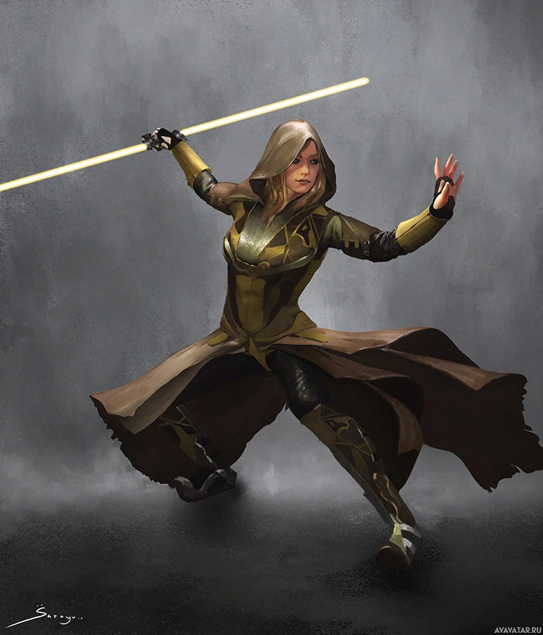 a dynamic pose with a lightsaber, wearing a hooded cloak and a costume that includes armor elements. This illustration captures the essence of the character's style and is likely created by an artist who enjoys or works within the Star