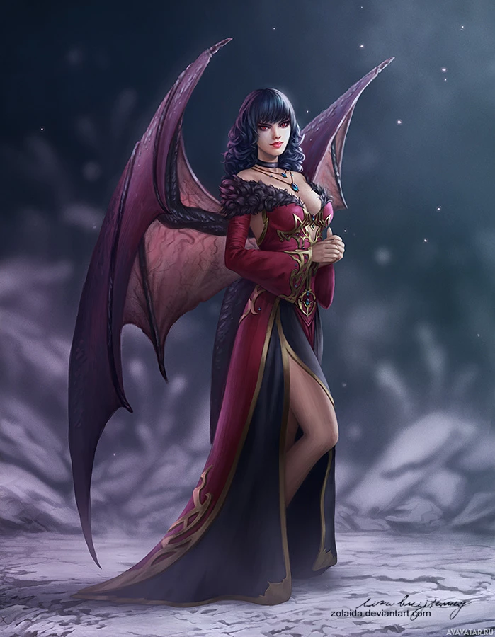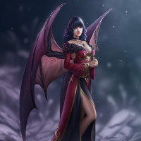 prominent wings with scales resembling those of a dragon. Her pose suggests confidence, and her expression seems contemplative or serious. The background is dark and moody, fitting the fantasy theme of the image.