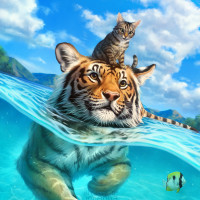 a whimsical scene where a tiger is swimming underwater with a cat perched on its back. They are surrounded by colorful fish, which add to the playful and fantastical