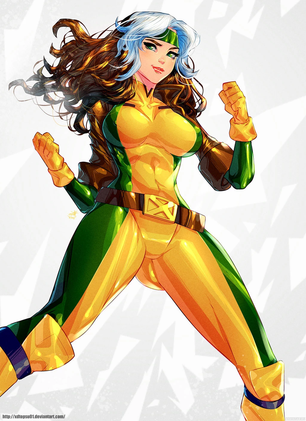 The image shows an illustration of a character dressed in the iconic yellow and green bodysuit, reminiscent of the X-Men's Rogue. This character is known for her ability to absorb other