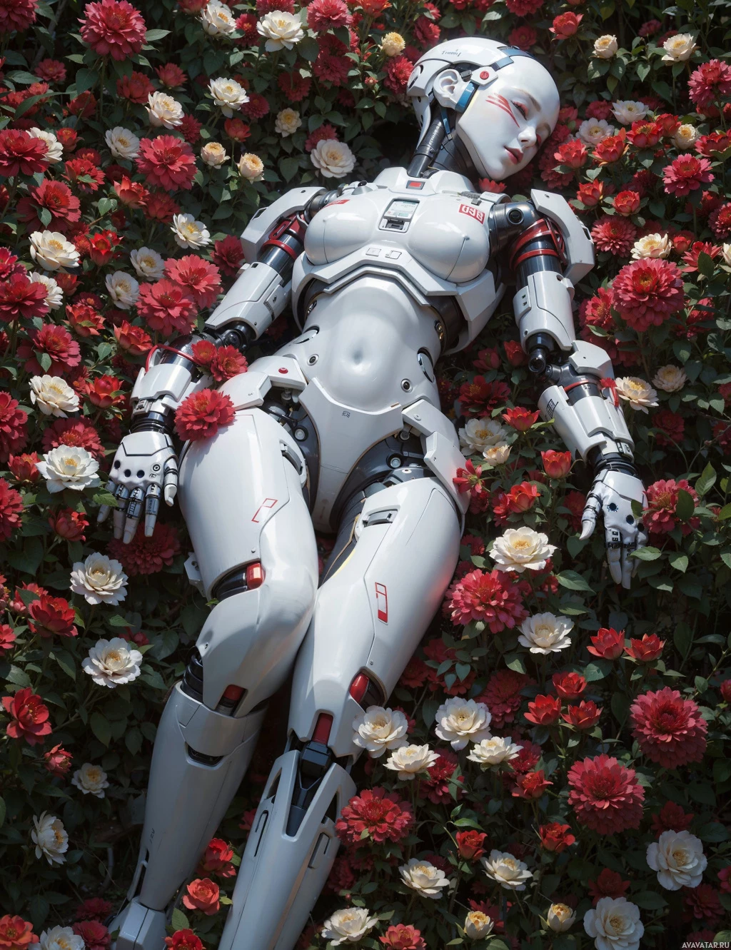 a humanoid robot with a sleek, silver-gray endoskeleton. It has closed eyes, which is unusual for robots as they typically have no eyes or mechanical versions. The robot is lying on its back within what appears to be a garden or