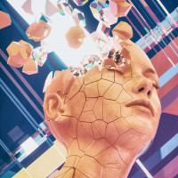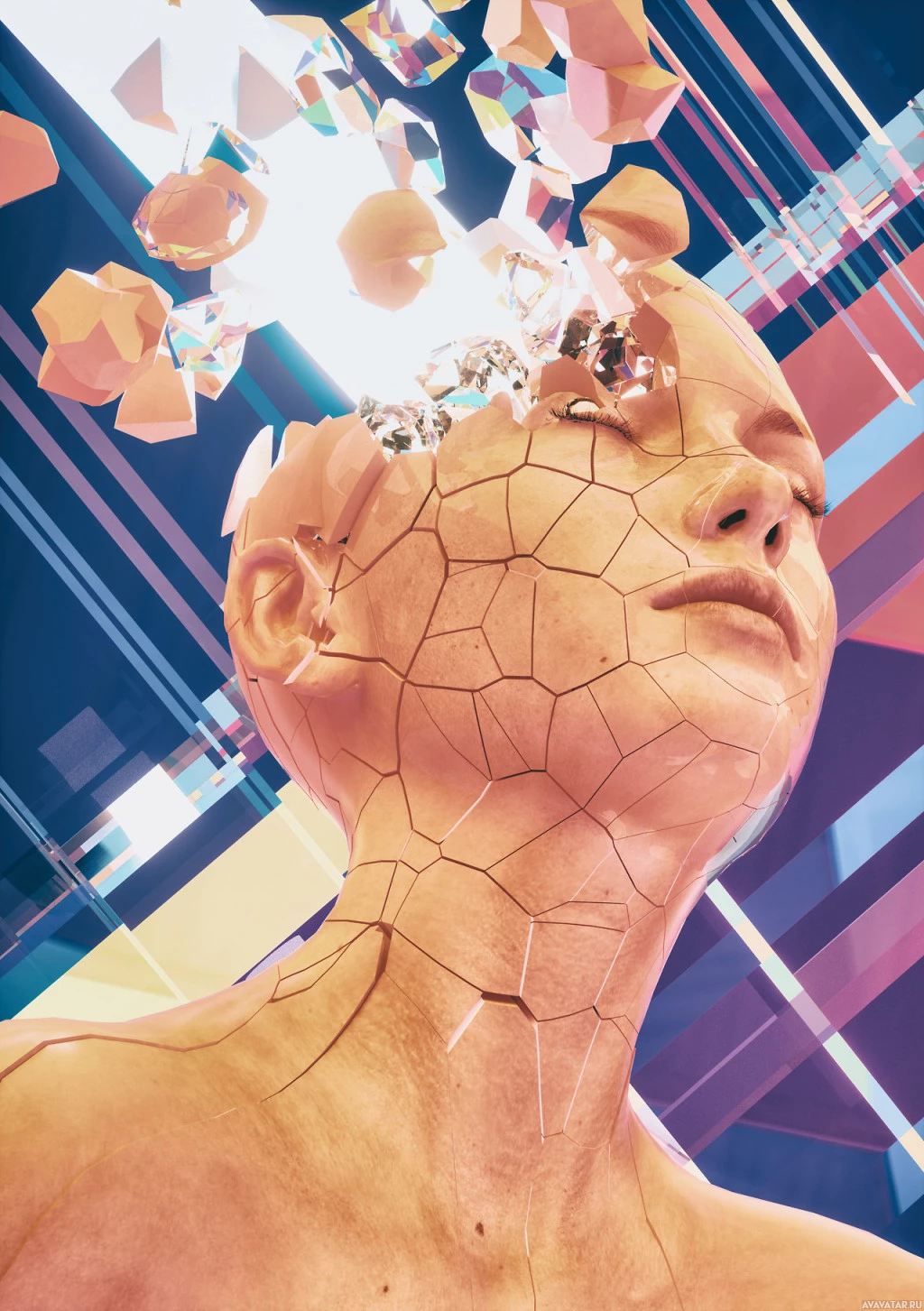 geometric shapes in shades of pink, blue, and yellow, which might be interpreted as a form of crystalline or crystal-like structure. The image has an otherworldly or surreal quality to it, blending organic human features with abstract