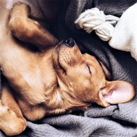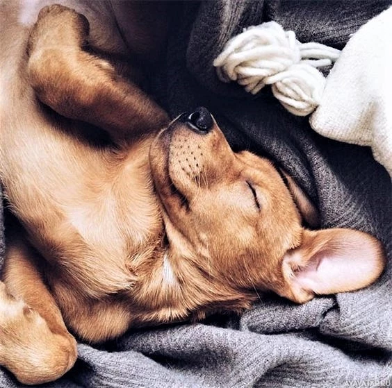 Картинка показывает собаку, свернувшуюся и спящую. Кажется, что он комфортно отдыхает, с закрытыми глазами и расслабленным телом. Фон предполагает уютную среду, возможно, в помещении. Собака, вероятно, наслаждается спокойным сном.