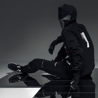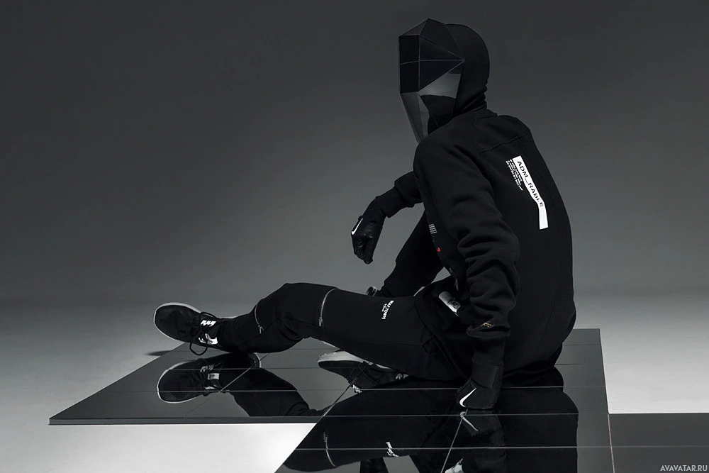 The image shows a person wearing a mask and a black tracksuit with white text or markings on it, sitting against what appears to be