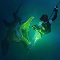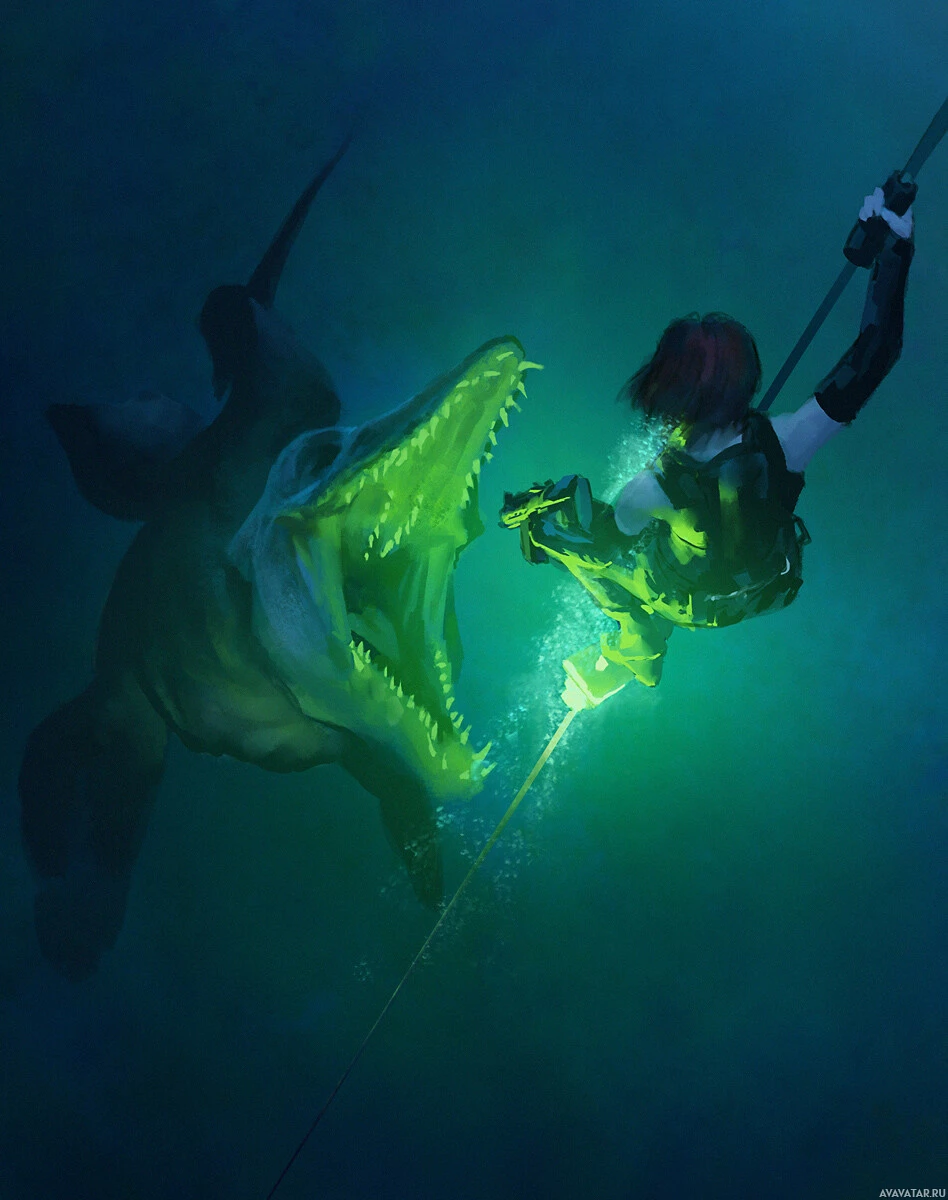 marine encounters. The water around them suggests that they are submerged deep under the ocean's surface. The scene is quite dynamic, with the shark being aggressive towards the girl. It has its mouth open in an attempt to bite her, and she appears to be defending herself. The lighting in the image suggests it might be taking place at night or in a deep part of the ocean where there isn't much sunlight filtering through. The artwork is rich in detail, capturing the intensity of the moment and the vastness of