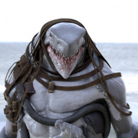 webbed hands and gills. This character is situated on the beach, looking towards the ocean. There's also some equipment or tools in the background that could suggest this character has been equipped for