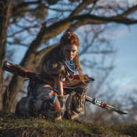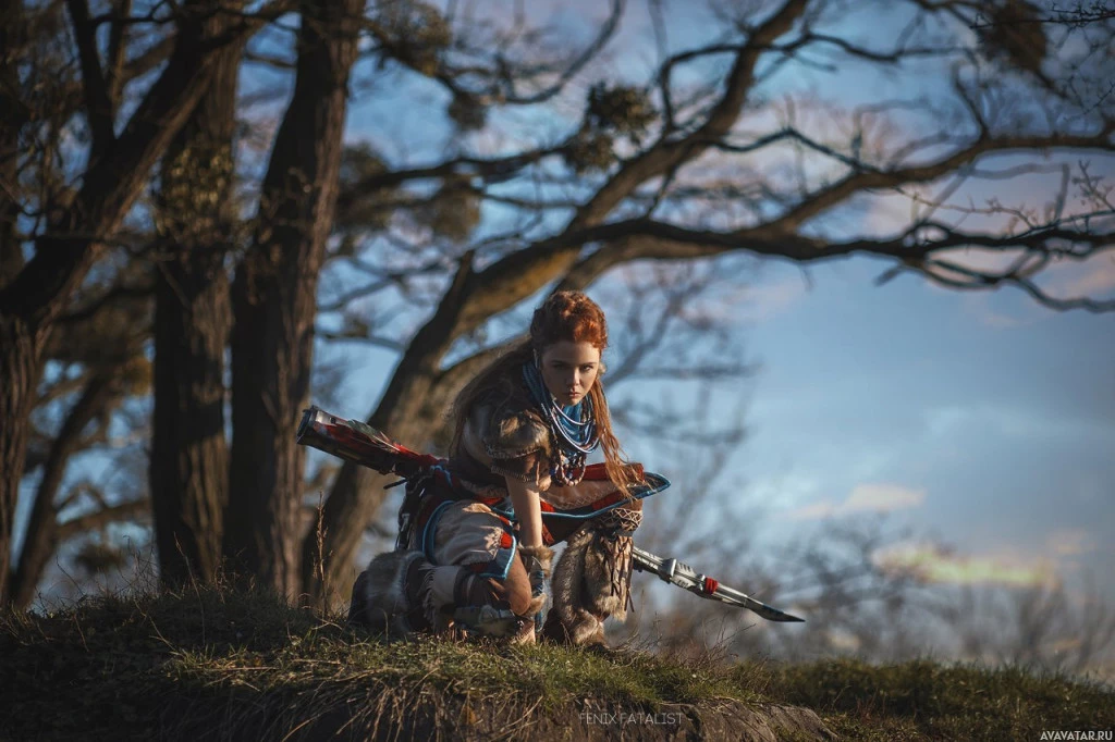 the video game "Horizon Zero Dawn." This character is known for using bows and arrows, and often takes on roles of a huntress or tracker within the game. The setting appears to be outdoors during twilight or dawn, with trees in the background under